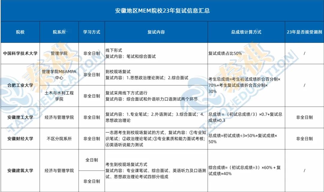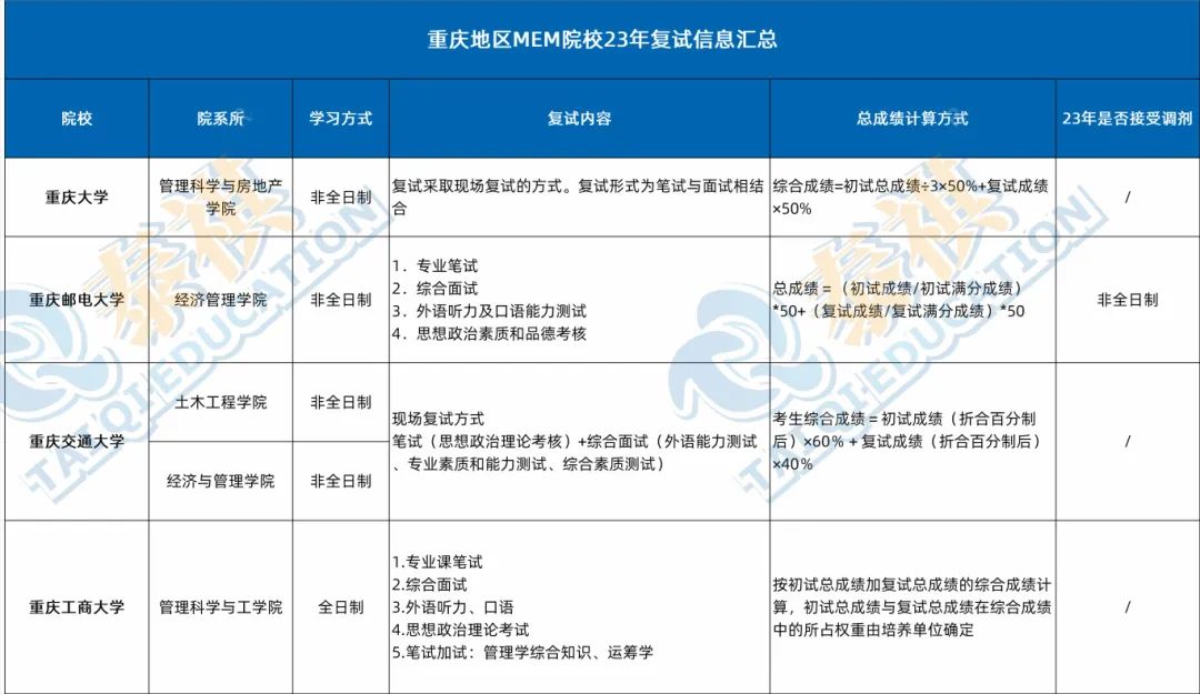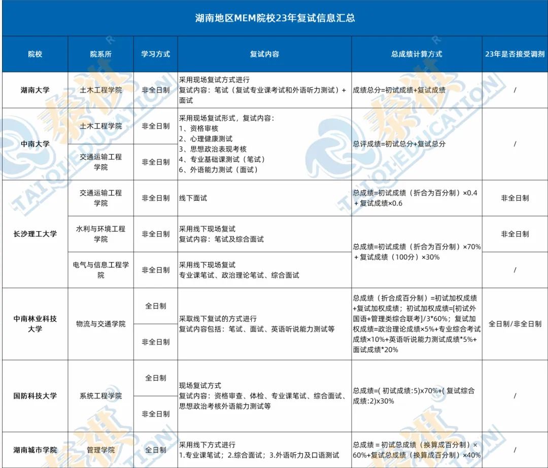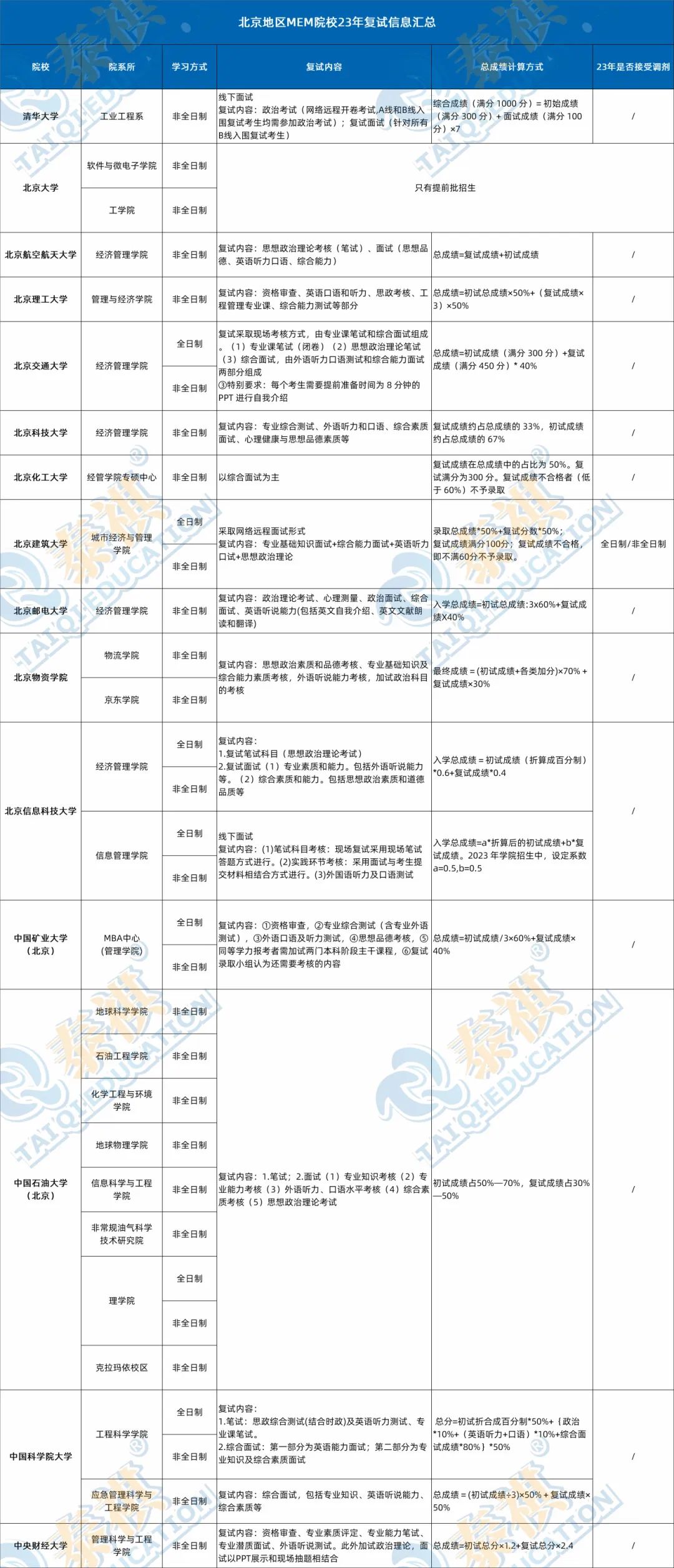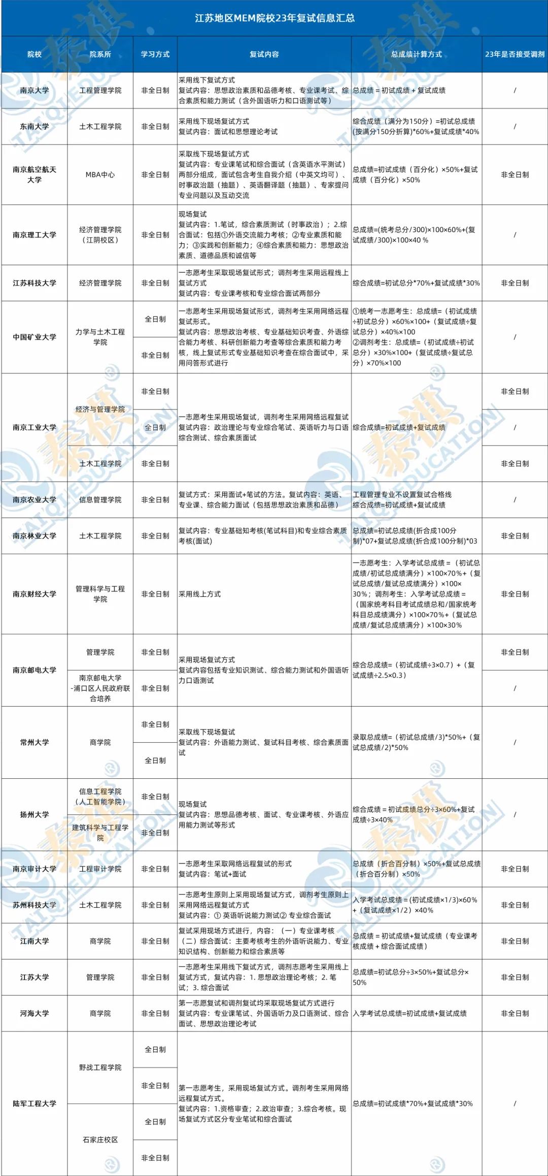 MEM不同院校的具体复试内容、复试流程、总成绩占比各有不同,今天我们就给大家整理了2023年MEM院校的复试调剂情况,给今年考研的宝子们参考一下哦~
