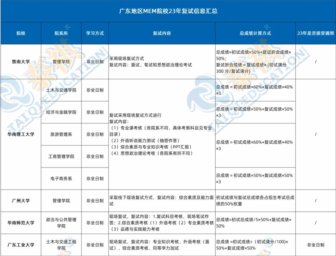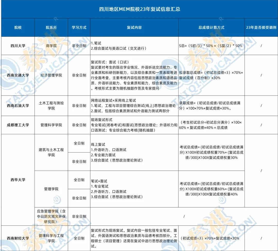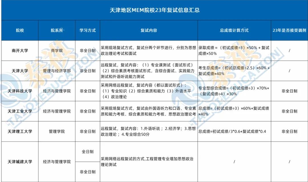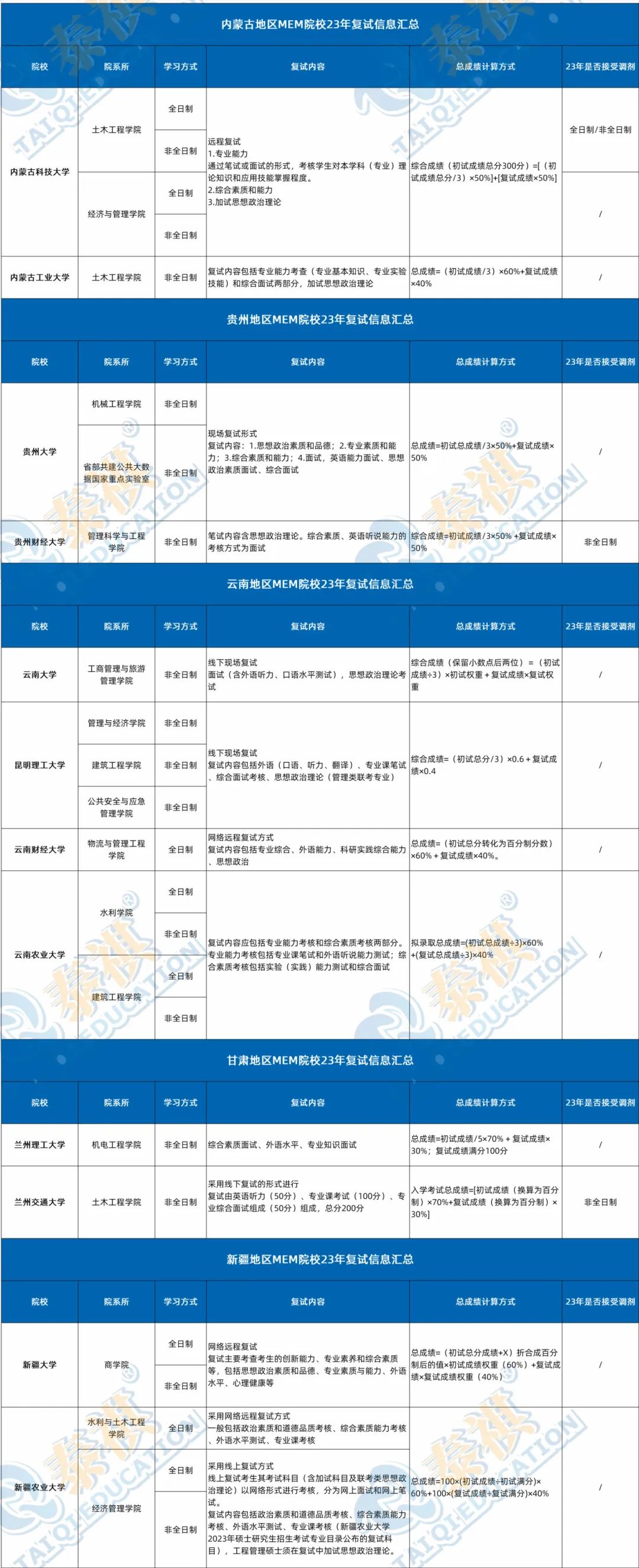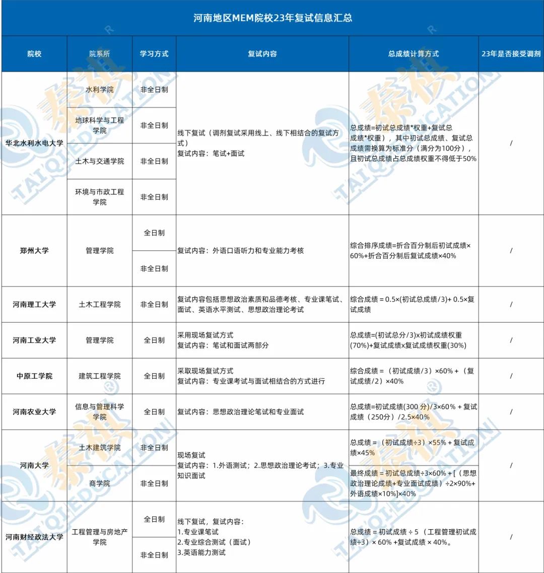 MEM不同院校的具体复试内容、复试流程、总成绩占比各有不同,今天我们就给大家整理了2023年MEM院校的复试调剂情况,给今年考研的宝子们参考一下哦~