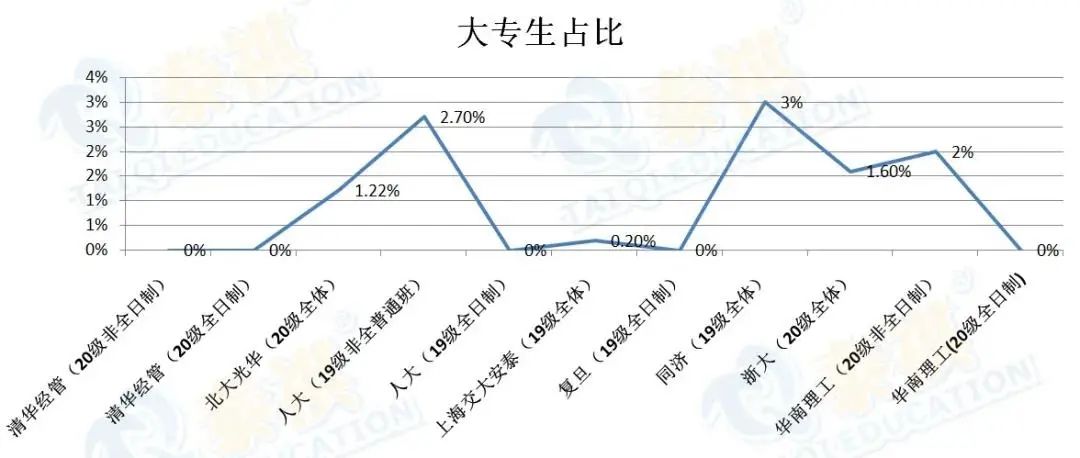 但是对于专科背景的考生来说,除了报考要求,还有另外一道关,那就是软性条件。从一份高校MBA新生学历占比中也可以看出,部分国内名校对大专生的录取比例相对较低,基本都是5%以下。