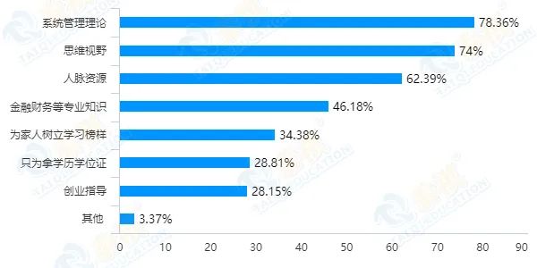 关于“期待读书带来的收获”,如图6,超过半数的学员期待获得系统管理知识、思维视野、人脉资源的提升,并不仅仅是为学历文凭,这确实是在职人群考管理类硕士的核心诉求,也是管理类硕士能吸引众多在职考生的竞争力所在。另外,寻求创业指导者也有28%之多,所以具有创业特色项目的院校也能多吸引一部分考生。另外值得一提的是,有34.38%的学员选择考研,出于为家人树立学习榜样的考量。