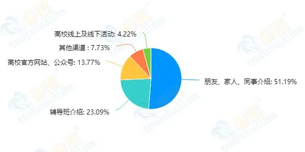 关于泰祺现有学员最先获知的高校信息的渠道,从图4可以看出,超出一半(51.19%)的学员是通过朋友、家人、同事介绍的,说明口碑相传影响力大,这与泰祺学员的渠道来源也是类似的。由此也印证了,做教育要踏踏实实靠口碑的办学理念。另外,有23.09%的学员是通过泰祺辅导班直接了解到院校情况,其余四分之一是通过高校官媒等其他渠道了解的。