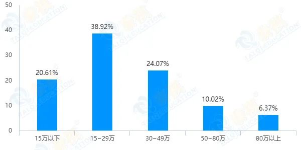 从图3,泰祺教育2020学员年收入分布来看,约38.92%的学员年收入在15-29万之间,这部分人群薪资上升空间较大,他们选择考研也相对容易提升薪资收入,获得发展机会。年收入30万以上的学员比例为40.46%,这部分人群大多处于企业高管位置,他们选择考研更注重个人格局与人脉的提升。