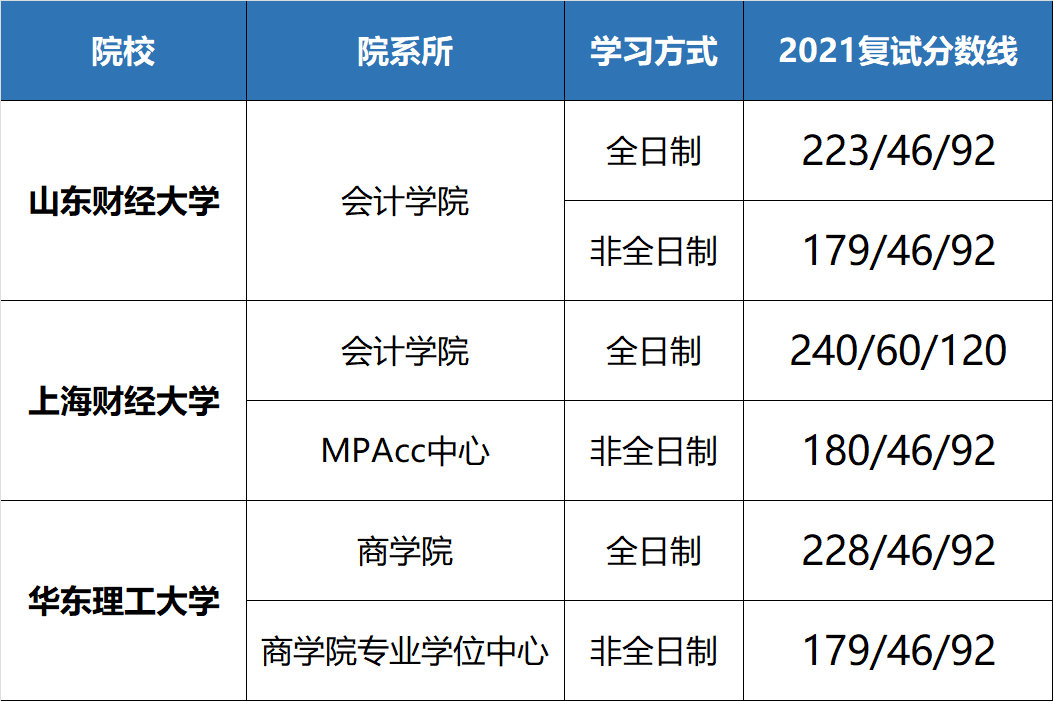 这几个学校全日制MPAcc复试分数线比较高,可以算是七大专业里面比较难考的。但是非全日制MPAcc分数线却是国家线或者接近国家线,甚至比其他一些学校的非全日制MPA、MEM专业分数线低。