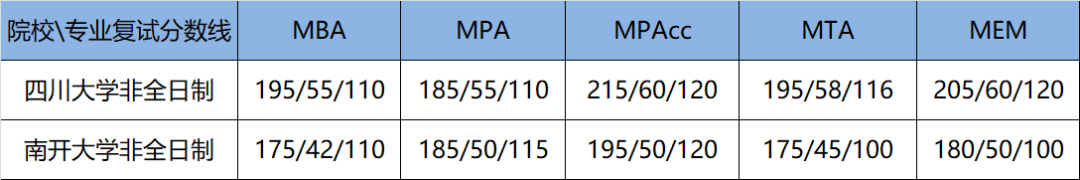 即使同为非全日制,各个专业的难度排序在不同院校也是不一样的,全国院校比较多,这里拿出两所院校来对比查看。(MBA专业的复试分数线都是未参加提面的复试分数线)