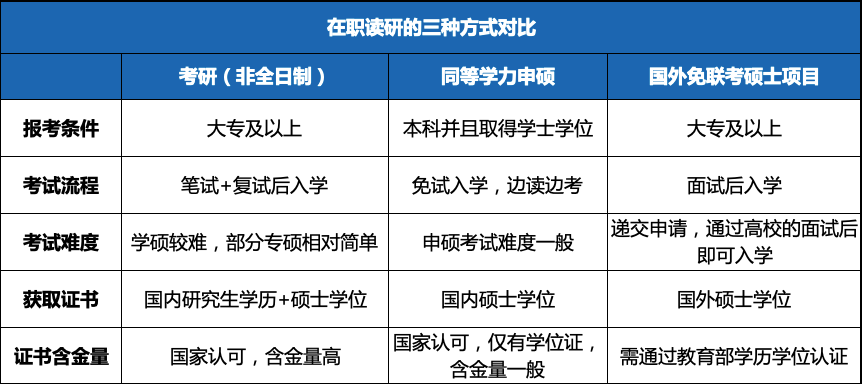 关于在职读研的三种主要方式的报考条件、考试流程、考试难度等,可以参考以下表格: