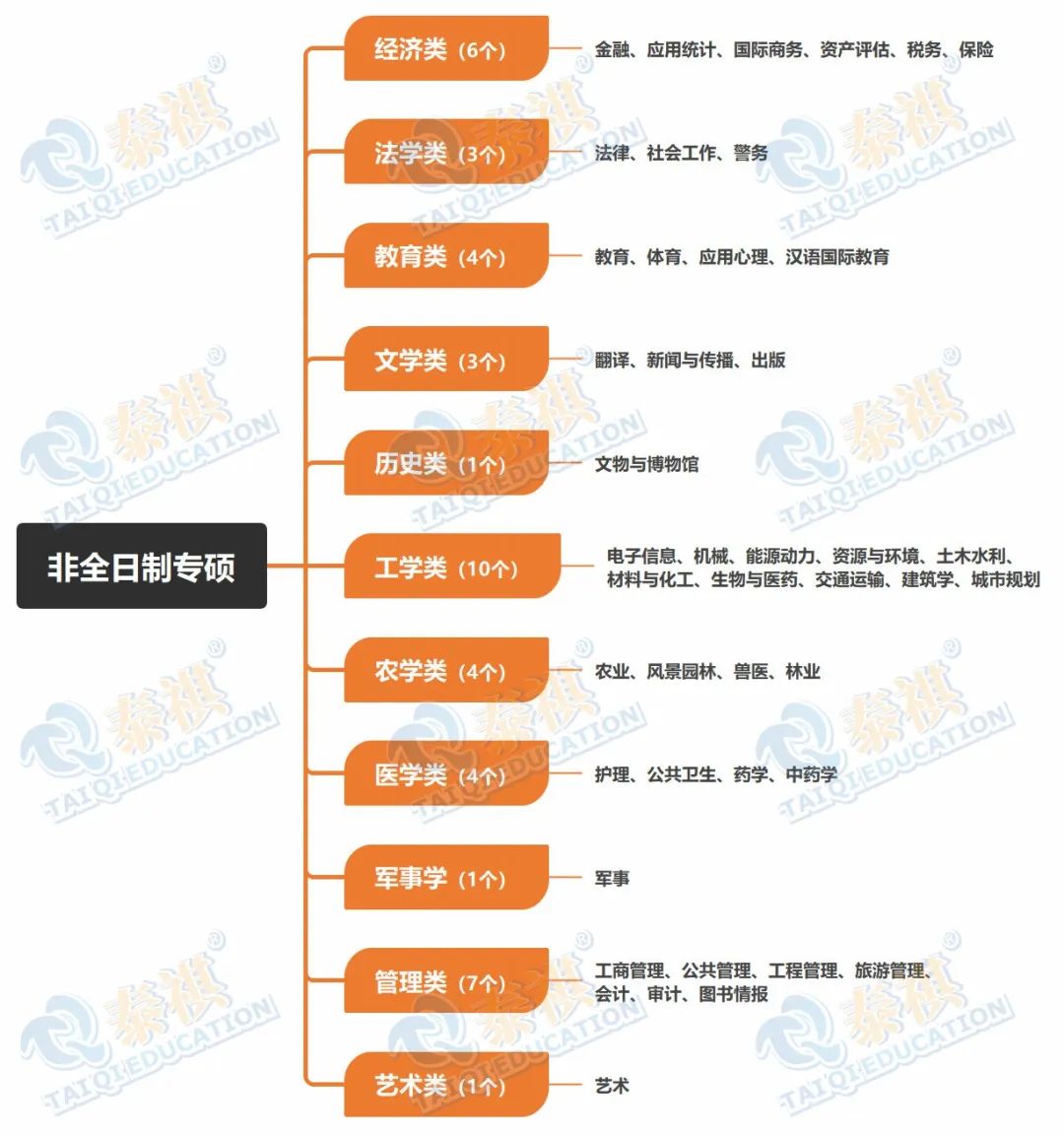目前专硕总共有47个学位类别,其中有3个医学类的专业硕士仅招收全日制(临床医学、口腔医学、中医),其他44个专业学位类别均招收非全日制。