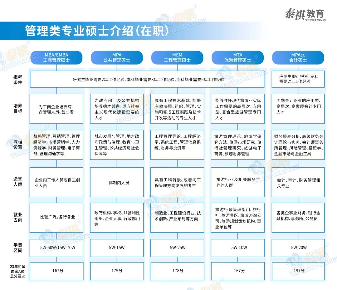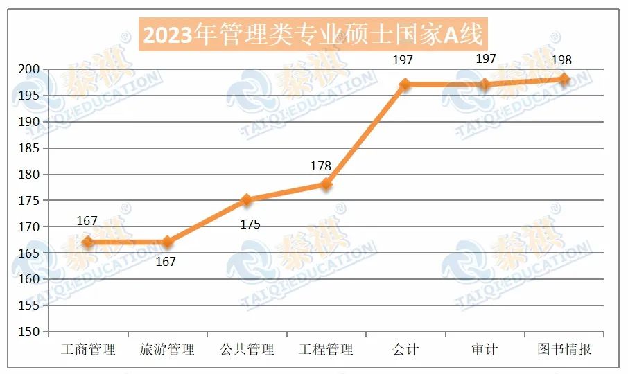 因为管理类专业初试总分是300分,而其他所有专业初试总分都是500分,所以管理类专硕需要单独来看。以2023年国家A线来看,管理类的七大专业分数比较低的是工商管理硕士MBA、旅游管理硕士MTA、公共管理硕士MPA、工程管理硕士MEM,都不超过180分,如果按照分值比例,都没有达到总分的60%,难度非常低。而会计、审计、图书情报的分数要求相对较高,接近200分,对于毕业时间较长的在职人来说,难度比较大。
