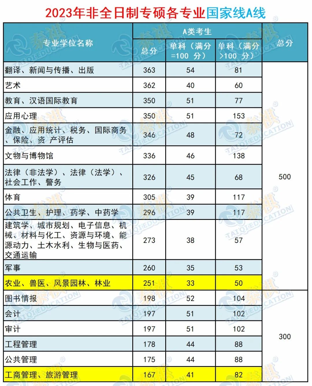 除管理类的其他专业,分数线要求最低的当属农学类了,2023年农学国家A线仅仅251分,也就比总分的一半多1分,真真真是分数要求非常低了。军事类、工学类、医学类专业的分数线线要求也不算非常高,也都没有达到总分的60%。但是教育类、艺术类、文学类的国家线要求则非常高,达到总分70%以上。