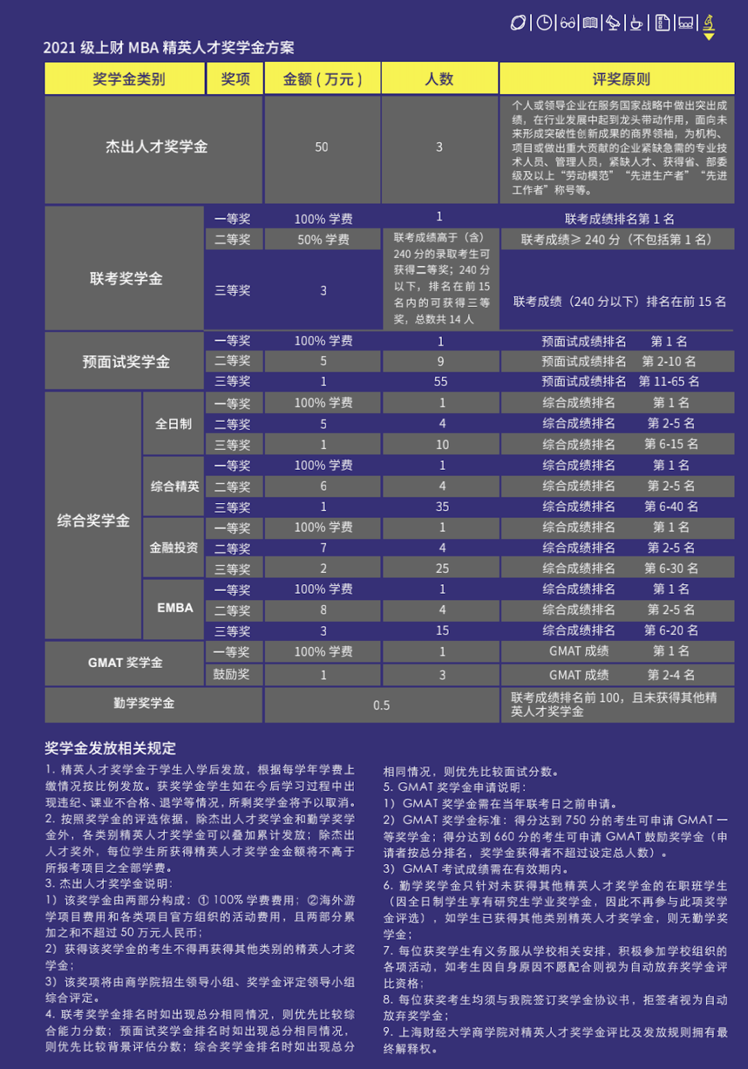 经上海财经大学商学院招生委员会审核通过,《2021级MBA新生奖学金方案》现已正式公布,具体奖项、金额和评奖原则设置如下: