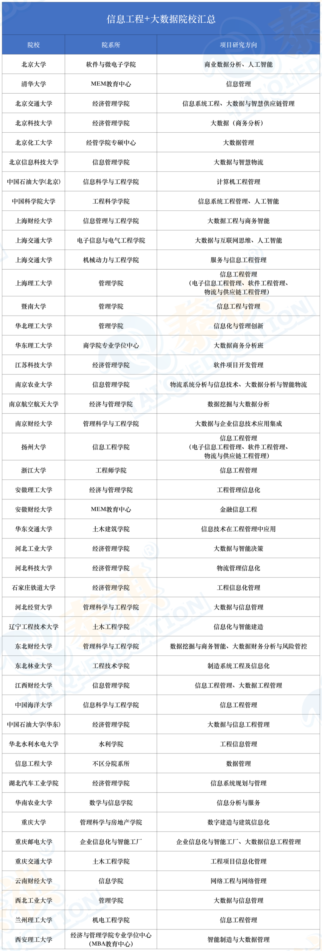 因为MEM解决的是工程中的管理问题,它基本涉及到所有的工程领域:包括建筑、微电子、能源、机械、智能制造、物联网、大数据、信息安全等。几乎每个MEM的院校都开设多个方向,那我们就从信息工程、建设工程、金融工程、项目管理四大主流方向出发,一起来看看属于工程人的热门方向院校!
