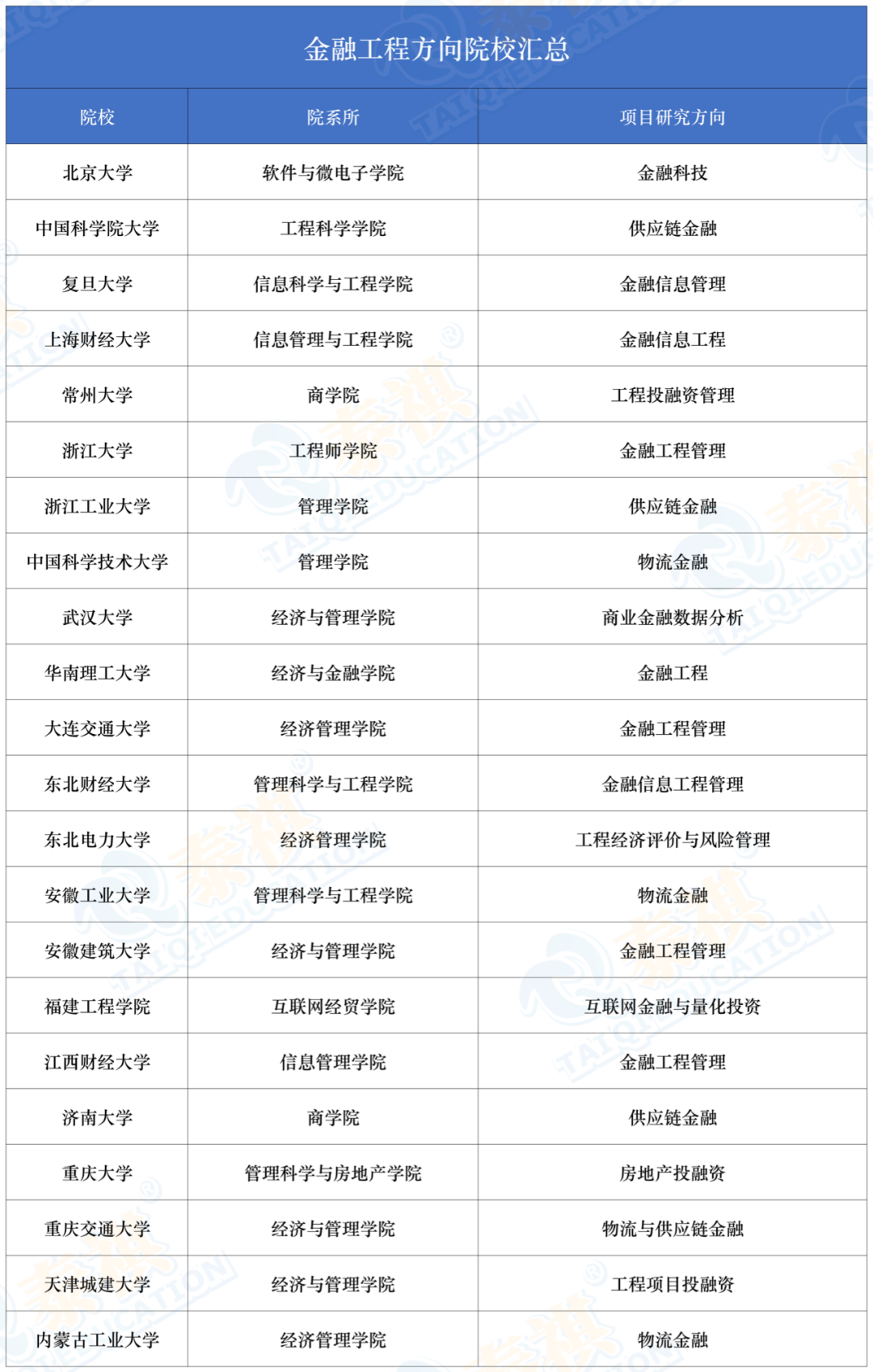 提到金融,更多人首先联系到MBA(工商管理硕士),但并不代表只有MBA才和金融沾边。不少MEM高校开设供应链金融、金融科技、金融工程管理等方向,让金融更加细分化。我们可以看看这些院校: