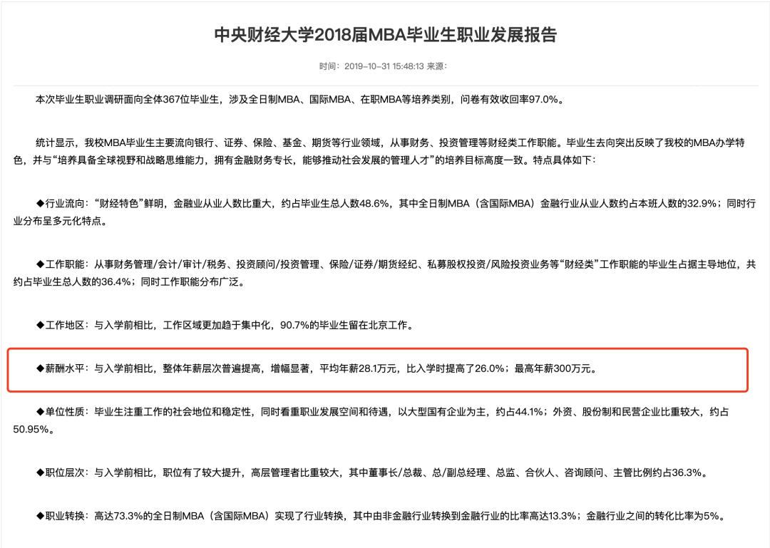 中央财经大学MBA2018年就业概况中,平均年薪28.1万元,比入学时提高了26.0%;最高年薪300万元。