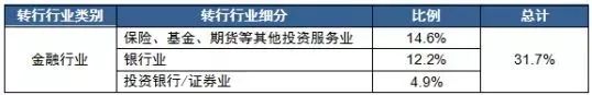中央财经大学的就业报告中,由非金融行业转换到金融行业的比率高达31.7%;金融行业之间的转换比率为17.1%;其中非金融行业转换到金融行业的具体细分情况如下: