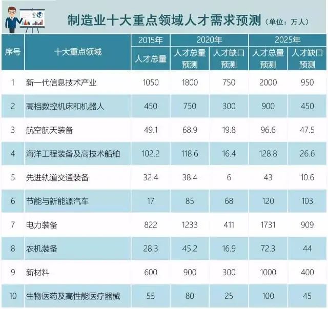目前我国的制造业处于转型期,即从部分行业的传统制造业向高端制造业转型。而且,制造业智能化是未来趋势。当今,中国的制造业存在诸多问题,其中之一就是高端人才的匮乏,人才数量不够,人才储备不足,人才质量不高。针对“中国制造2025”,未来十年,新一代信息技术产业、数控机床与机器人、航空航天设备等十余个领域会有非常大的人才需求。