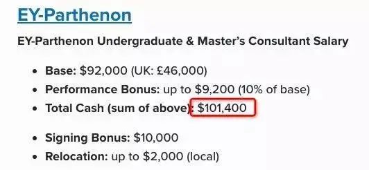 Management Consulted发布的2020咨询公司应届生起薪,四大咨询中EY-Parthenon的底薪达到了$92,000,加上10%底薪的Bonus,Total Cash达到了$10w!!