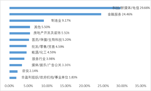我们可以看到,金融服务虽然占比高,但科技、新媒体、电信、制造业等等行业也算是百花齐放、颇有占比。