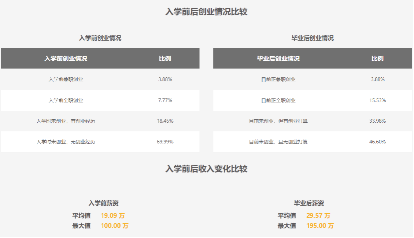 据浙江大学管理学院2017届MBA就业情况分析,学员入学前薪资平均值19.09万,最大值100万,毕业后薪资平均值29.57万,最大值195万,薪资增长幅度明显,且创业及打算创业人数比例也提升不少。