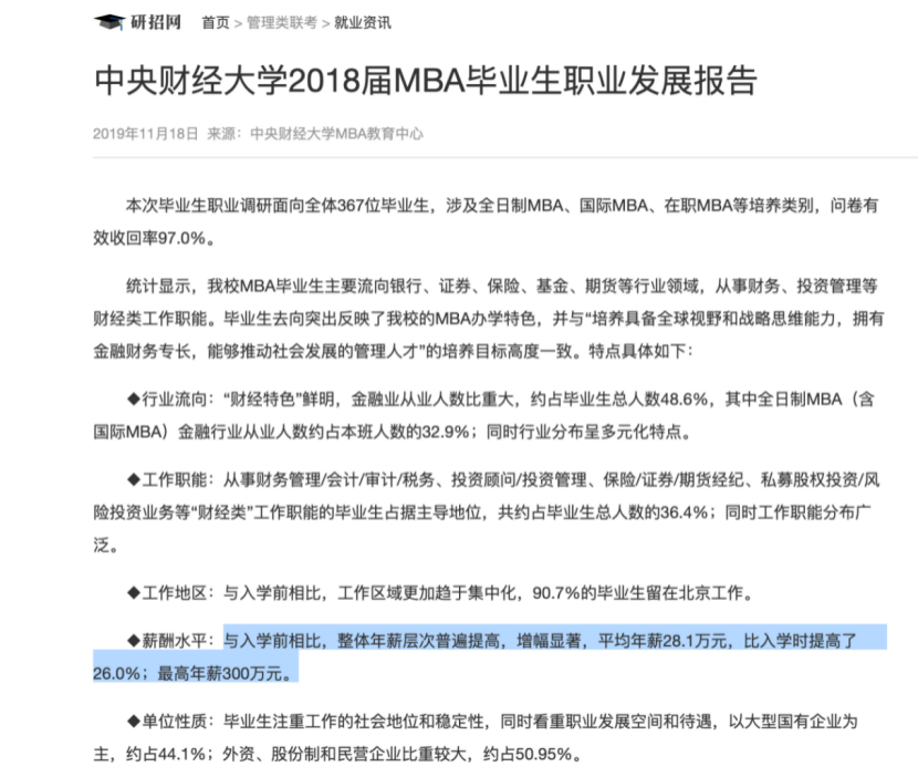 中央财经大学MBA2018年就业概况中,平均年薪28.1万元,比入学时提高了26.0%;最高年薪300万元。