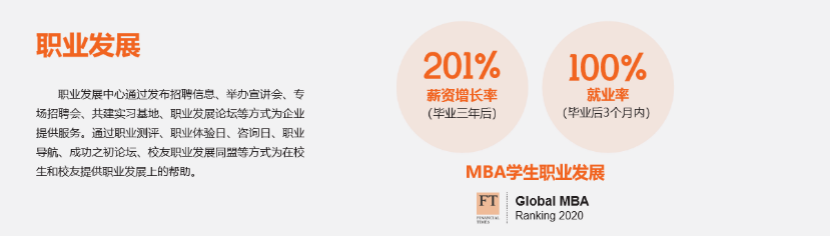 交大安泰2021年入学MBA宣传册职业发展显示,上海交通大学安泰经济与管理学院MBA学生毕业三年后薪资增长率达201%。