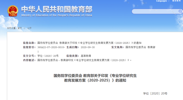 9月30日,一纸国务院学位委员会和教育部印发的《专业学位研究生教育发展方案(2020-2025)》的通知引起了考研界的广泛关注。