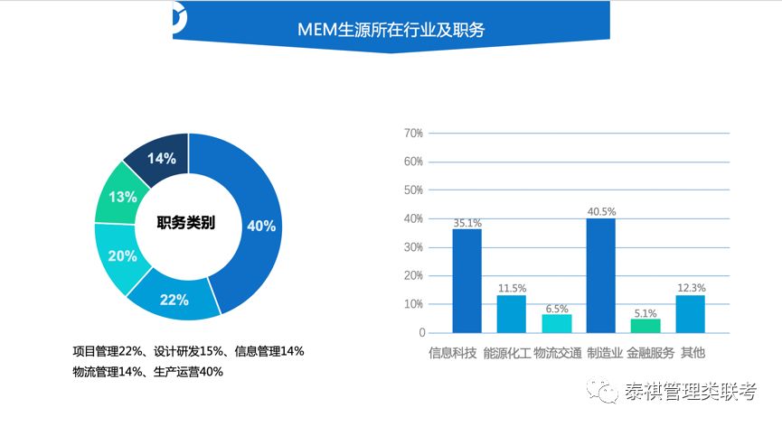 据小编通过各院校调查得知,MEM报考学生年龄范围分别25-45不等,主要任职于公司项目管理、技术管理、运营总监等高技术工种,而且分别来自建筑工程、生产制造、信息科技、化工能源、金融服务等众多行业。以下图表带大家清楚了解一下: