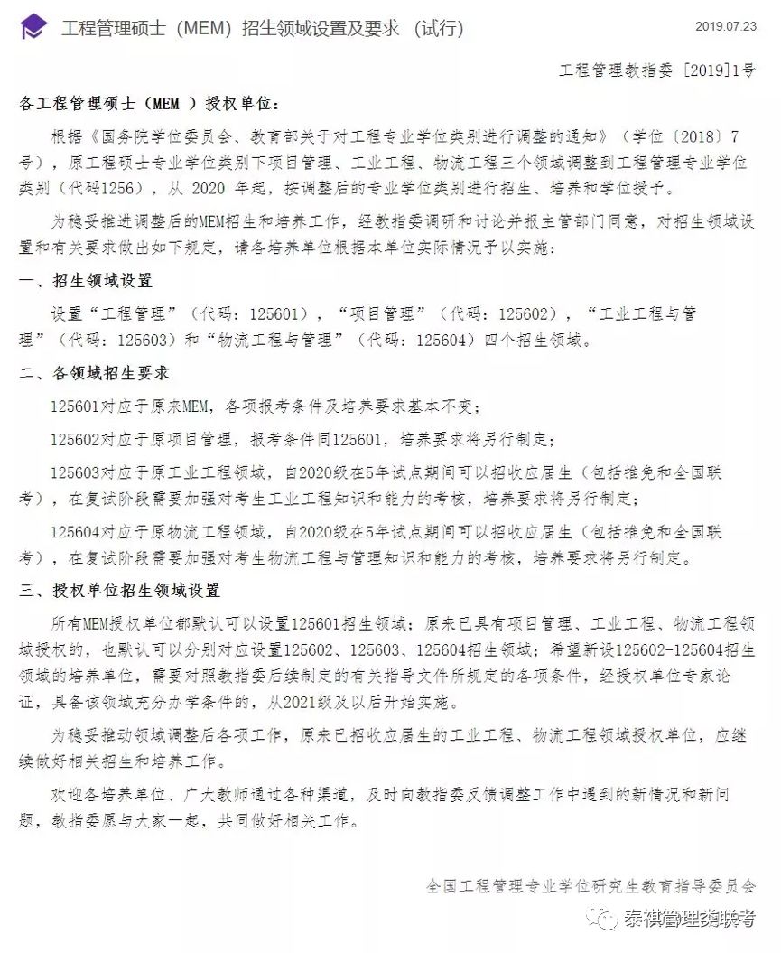 MEM项目设置“工程管理”(代码:125601),“项目管理”(代码:125602),“工业工程与管理”(代码:125603)和“物流工程与管理”(代码:125604)四个招生领域。“工程管理”、“项目管理”的报考条件同原来的MEM报考条件。“工业工程与管理”和“物流工程与管理”,自2020级在5年试点期间可以招收应届生(包括推免和全国联考)。