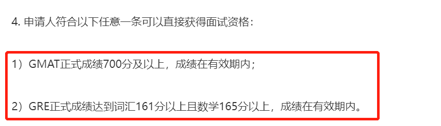 这两个考试都是国际研究生入学考试,很多名校都明确表示过,只要你的参加过GMAT和GRE,并且达到一定成绩,就可以直接获得面试资格。例如: