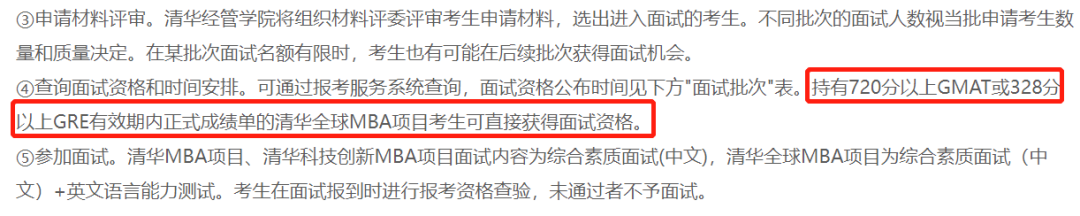 持有720分以上GMAT或328分以上GRE有效期内正式成绩单的清华全球MBA项目考生可直接获得面试资格。