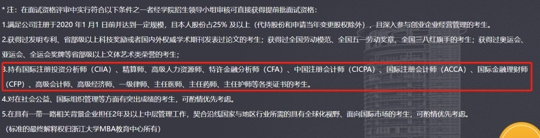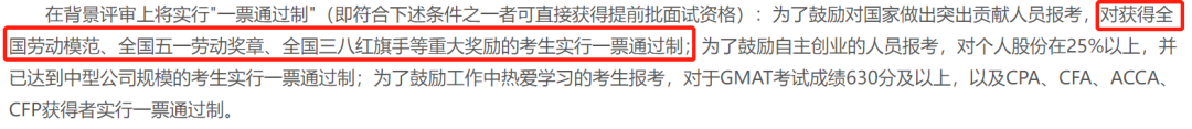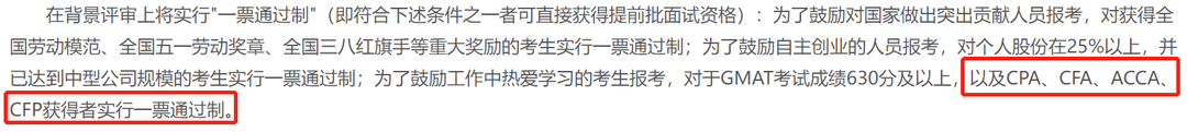 除了一些常规资料之外,如果你拥有一些MBA比较重视的证书,在部分院校可以享受“一票通过制”,即不用通过资料审核的环节,直接获得MBA提前批面试资格(注意,不是直接获得面试优秀成绩)。