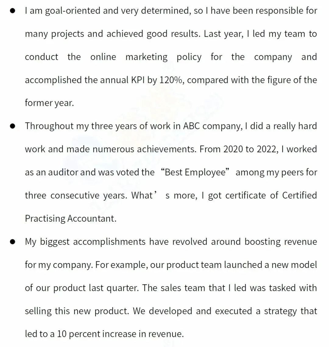 需要注意的是,除了描述工作情况外,核心优势以及取得的成绩也非常重要。有实力的申请者大有人在,想在面试中脱颖而出,需给考官留下“你值得”的印象。大家要准备好相关内容哦。