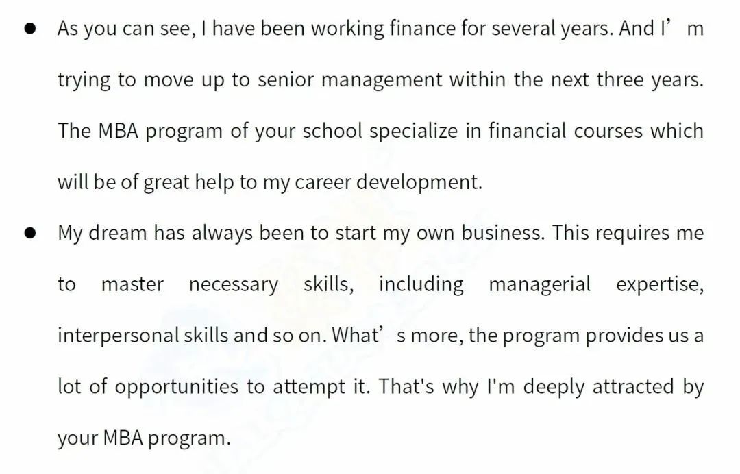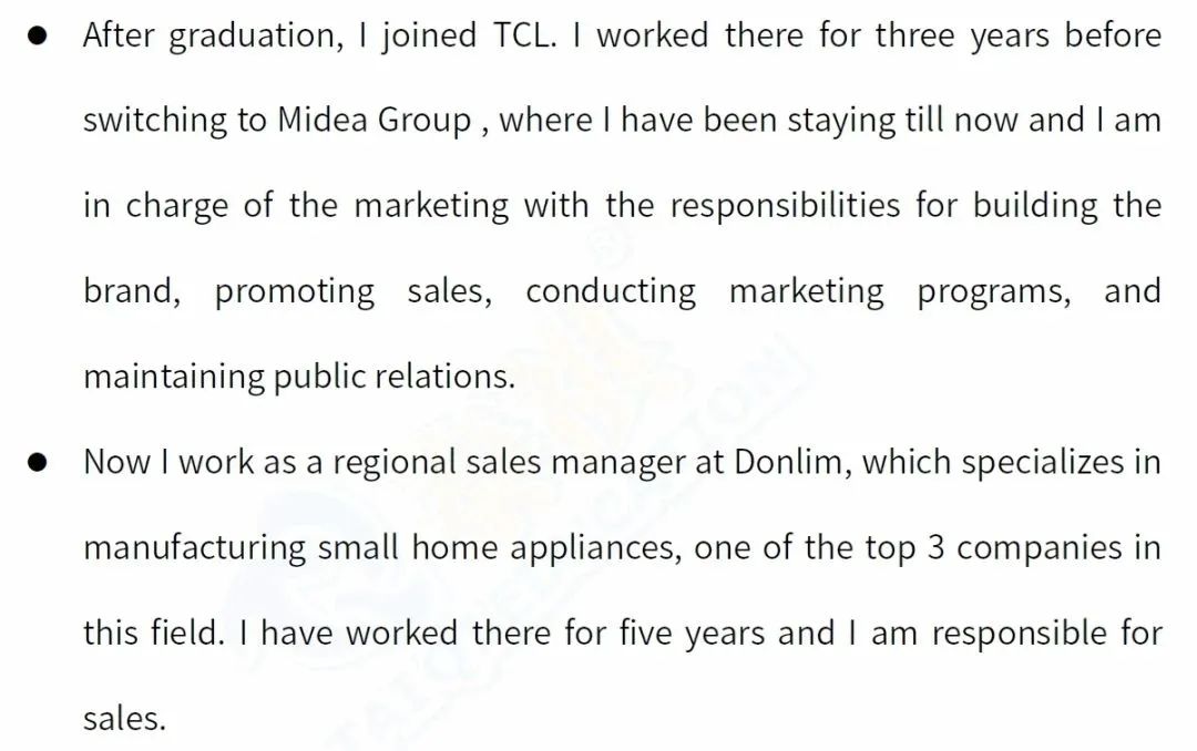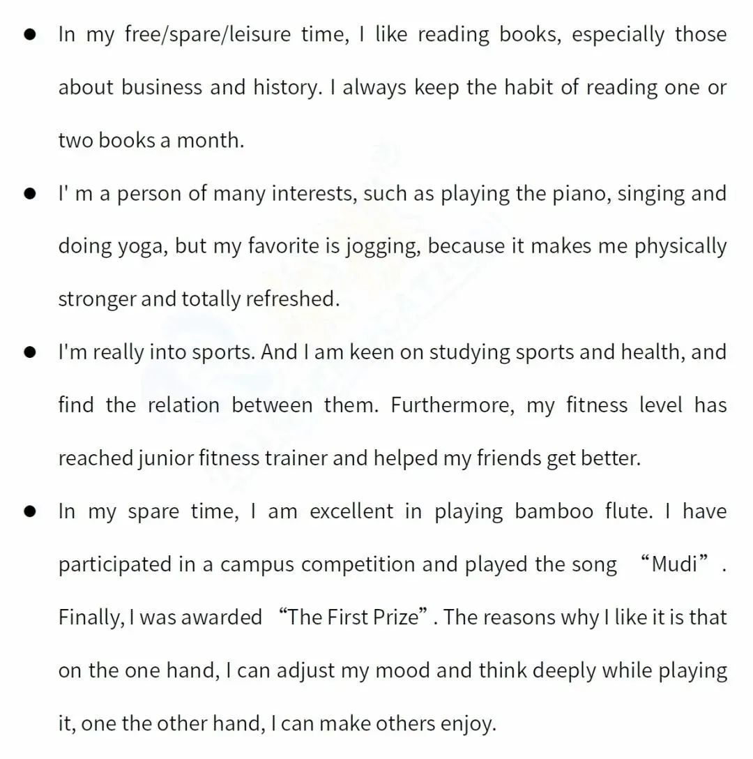 除了讲述工作外,也可以讲一讲自己的兴趣爱好,展现出“既会工作,又会生活”,爱好可以从读书、运动等方面展开,留下个人化印象的内容,简单说明这些爱好对你的积极意义(build my body, relax myself, open my mind...),注意避免提到那些可能引起老师反感的话题。假如个人工作或者管理经验没有特别突出的话,在这部分可以多说说。