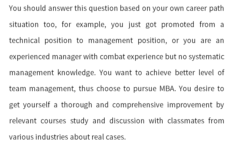 另外,关于职业规划的相关问题是需要紧密结合所申请的项目进行阐述的,并且结合你目前的现状与水平,从中找到差距。其中的差距恰好是MBA等项目能够帮助你提升的。