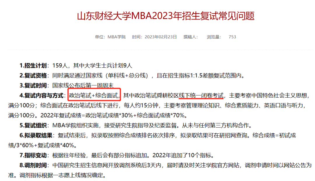 山东财经大学MBA2023复试为政治线下闭卷笔试