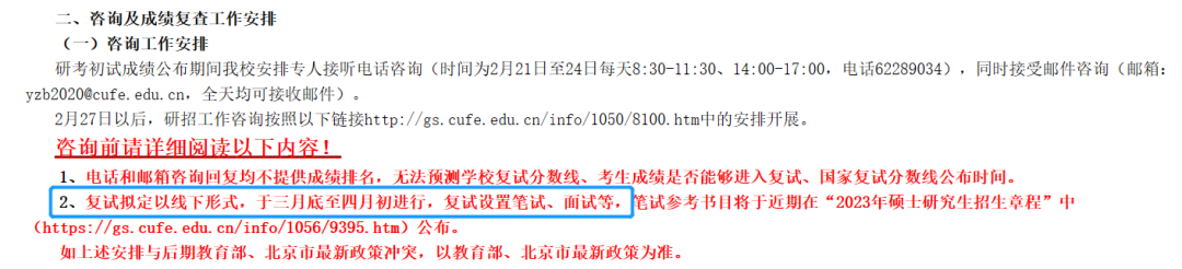 中央财经大学2月21日发布成绩公布公告时写到:复试拟定以线下形式,于三月底至四月初进行,复试设置笔试、面试等,笔试参考书目将于近期在“2023年硕士研究生招生章程”中公布。