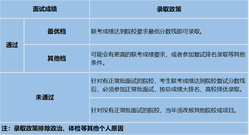 名称不同,本质相同。具体的面试结果及录取政策以报考院校规定为准。最终提面最终结果大致如下图: