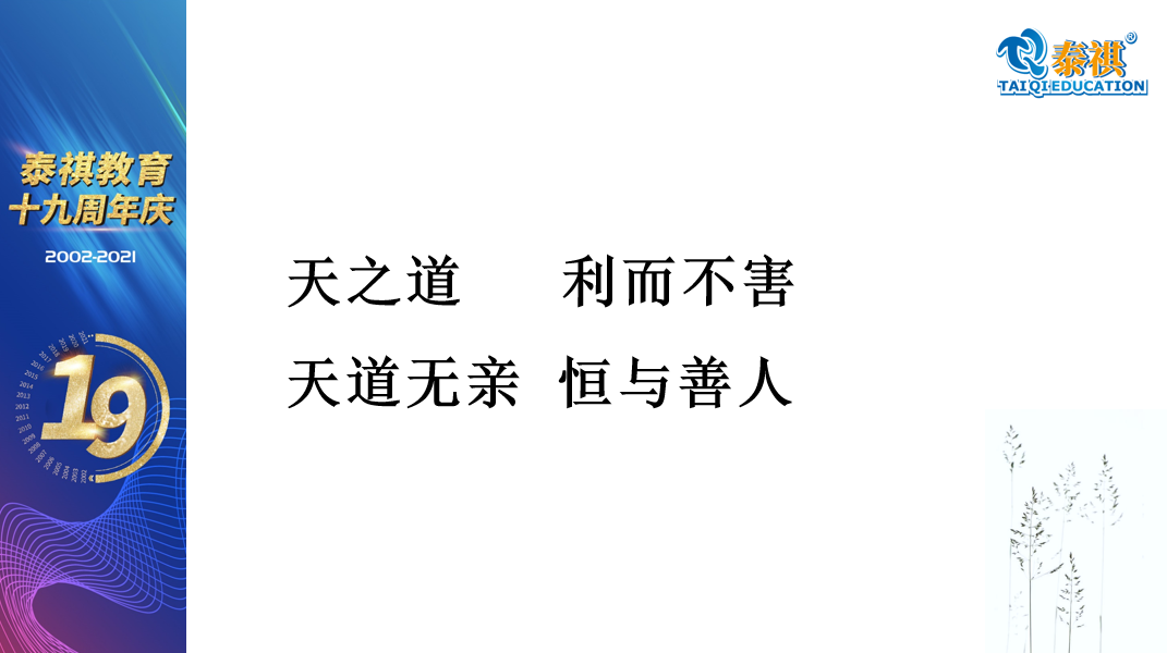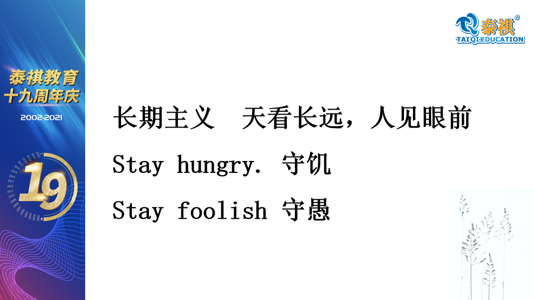 关于泰祺的成长,我讲一下。我们这家公司十九年了,但是大家知道培训机构大部分都是小机构,小微企业太多了,我们也属于中小企业。但是我们活了十九年没有死掉,而且还越活越好,它是有一点原因的。我觉得第一因为我们是强价值观的公司,我们公司对价值观要求比较高。强价值观、走正道、守底线,是我们一直强调的。