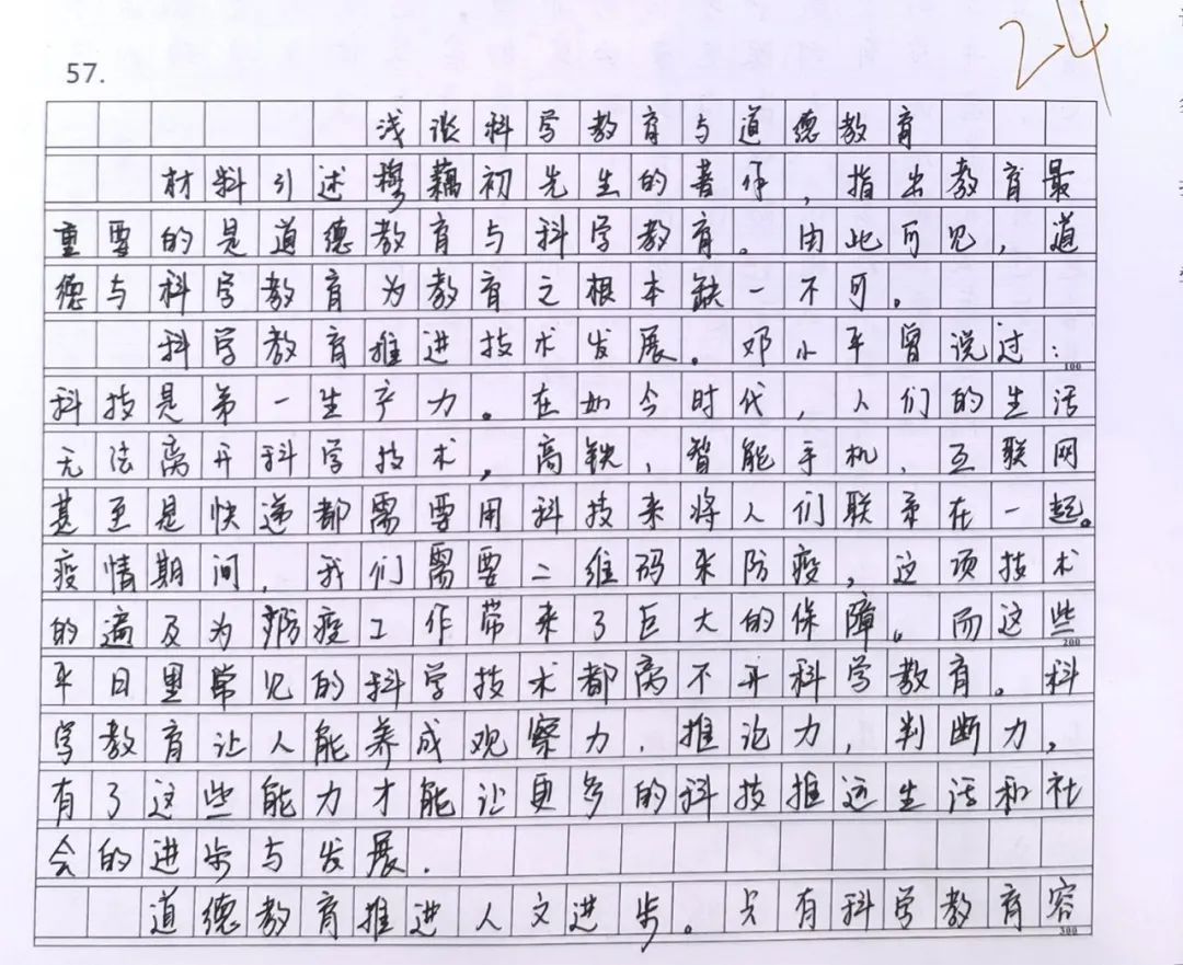 文章立意准确、结构完整、层次清晰、卷面整洁,整体表现较好。其中第二段以“科技是第一生产力” 入手,将理论和现实结合,在日常生活中凸显科学精神,并归结于科学教育,突出了科教的作用。第三段道德教育部分采用经典人物案例来论证分论点,并且做到有理有据;段尾处通过对“科教、德教“的强调突出道德是社会进步的基石,进一步强化分论点。第四段的内容将二者融合贯通,彰显社会进步过程中需要二者共同发挥作用。文章在有限字数内清晰的表达出了两个重要的观点,值得肯定。但也有不足之处,文章过多的引用和描述案例,占据了自己分析的内容,使文章看着像是“案例堆砌”,而不是一个带有个人分析和思考的论说文。