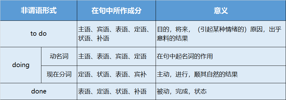 相信大家通过上面的真题例句对非谓语动词有了一个初步的认识。下面的这张表格罗列了常见的非谓语动词分类、特征、充当成分: