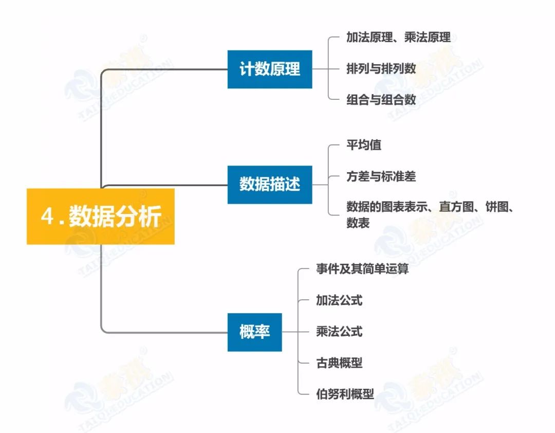 其中排列组合2-3题,数据分析1题,概率2-3题。本部分相对抽象,属于难点。