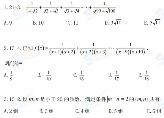 根据以往经验这部分得分相对较容易,主要两种题型:数的概念性质和运算技巧。运算技巧主要是裂项相消,有理化相消。