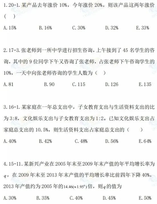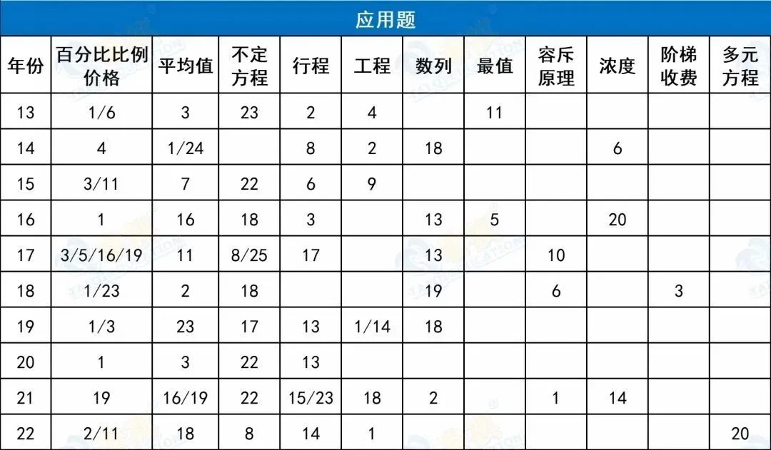 通过统计发现应用题中:比例百分比、平均值、不定方程、行程、工程、数列为必考知识点;最值、容斥原理、浓度、阶梯收费出现频率略低。