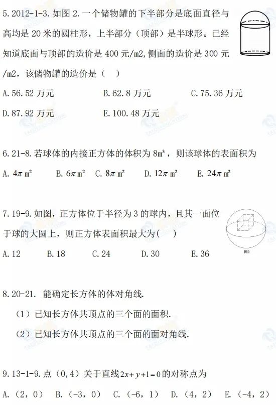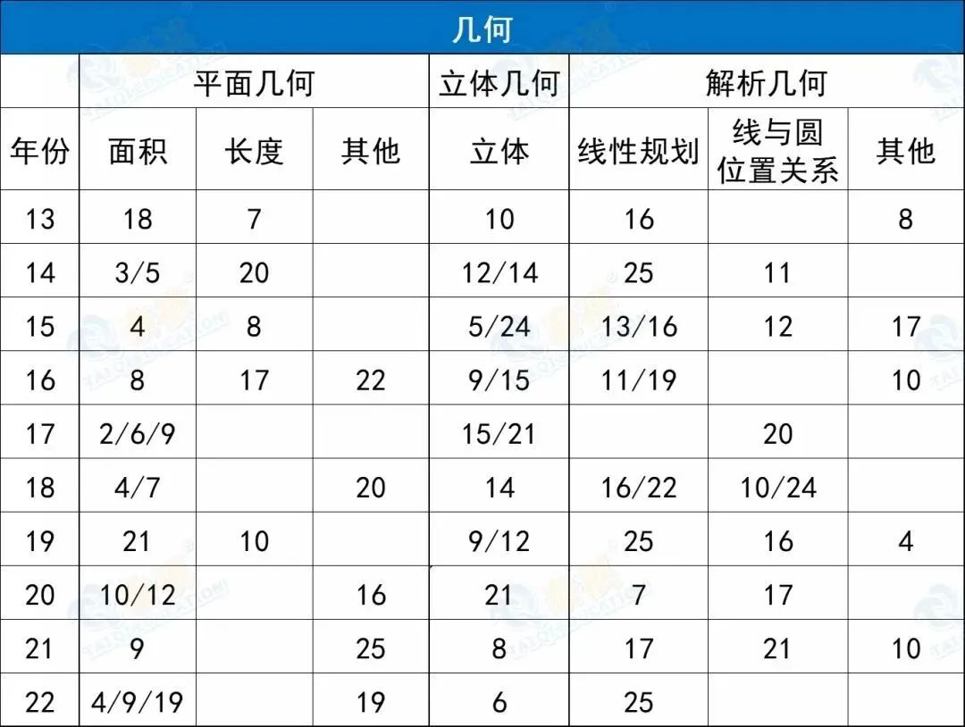 根据统计平面几何求面积和长度,解析几何线性规划和线与圆位置关系,立体几何中相关公式为必考知识点;平面几何中其他主要是:一些几何图形性质,比如外心,全等相似判定等;解析几何中其他:对称、圆与圆位置关系,几何图形围成面积。