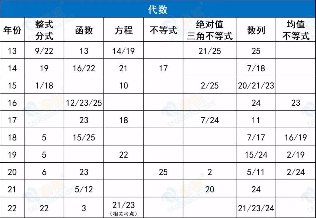 通过统计可以看出函数(二次函数)、方程(一元二次方程)、数列为必考知识点;代数式求值、均值不等式、绝对值及三角不等式为重要知识点。
