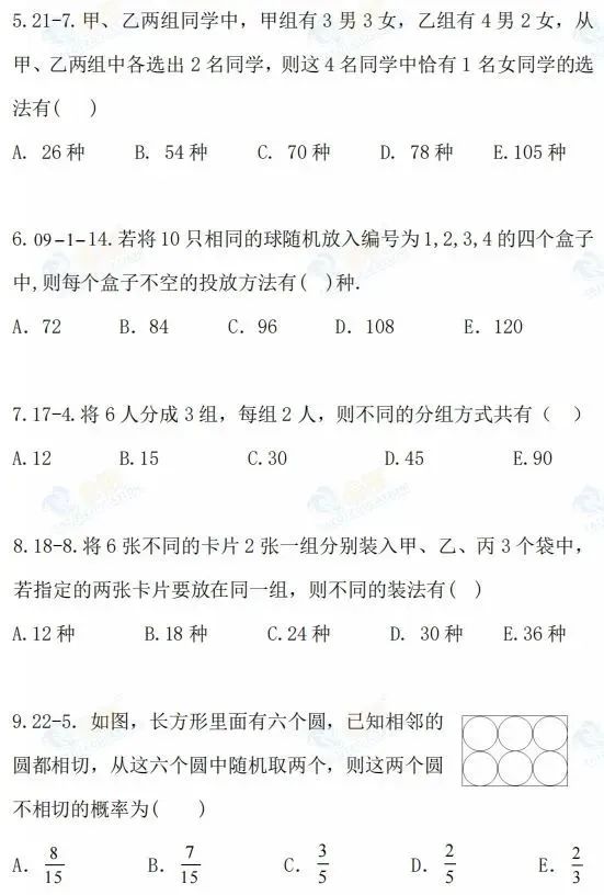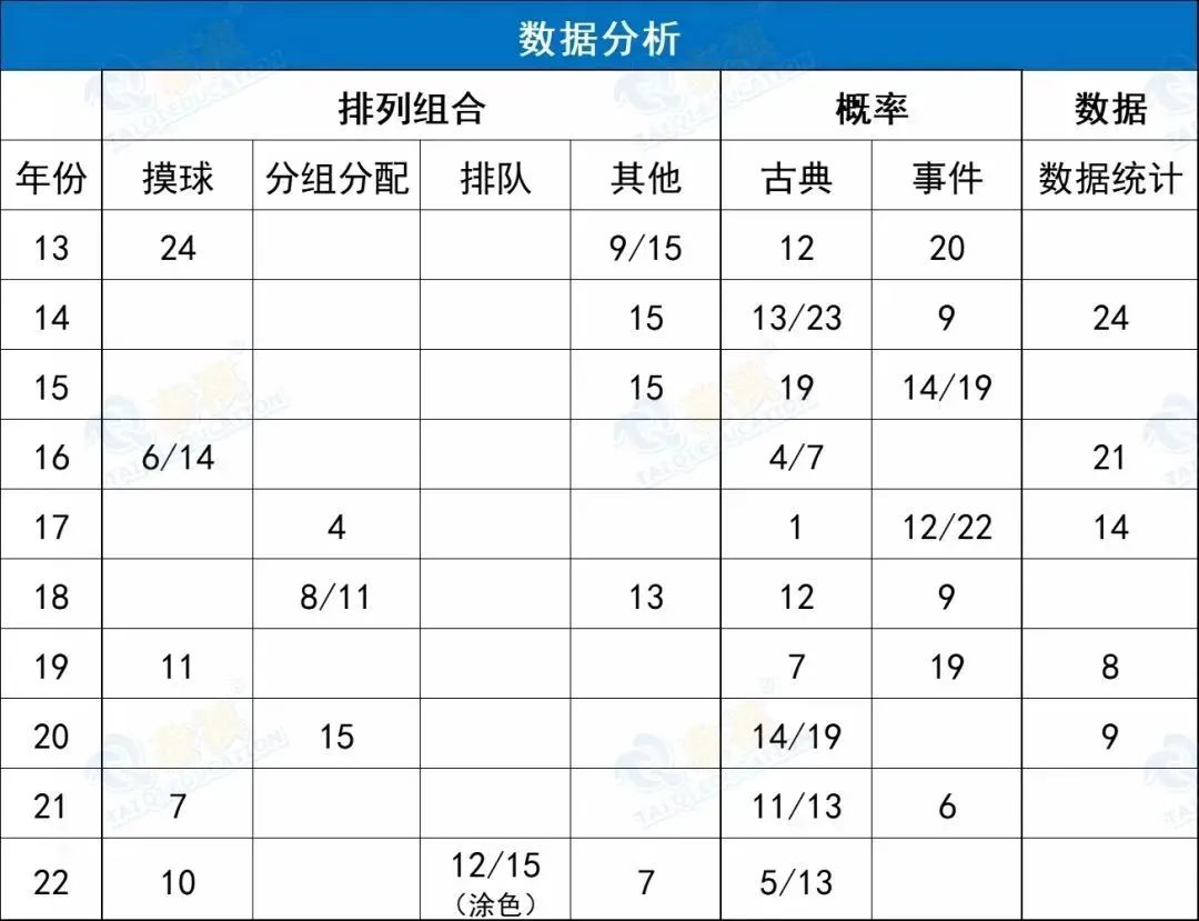 根据上述统计:排列组合中摸球和分组分配为近些年重要考点,概率考两种概率模型分别为古典概率和事件概率。数据统计主要是方差和标准差计算。