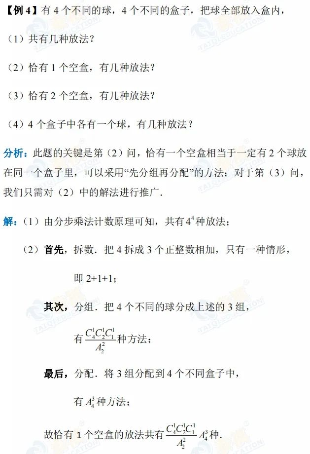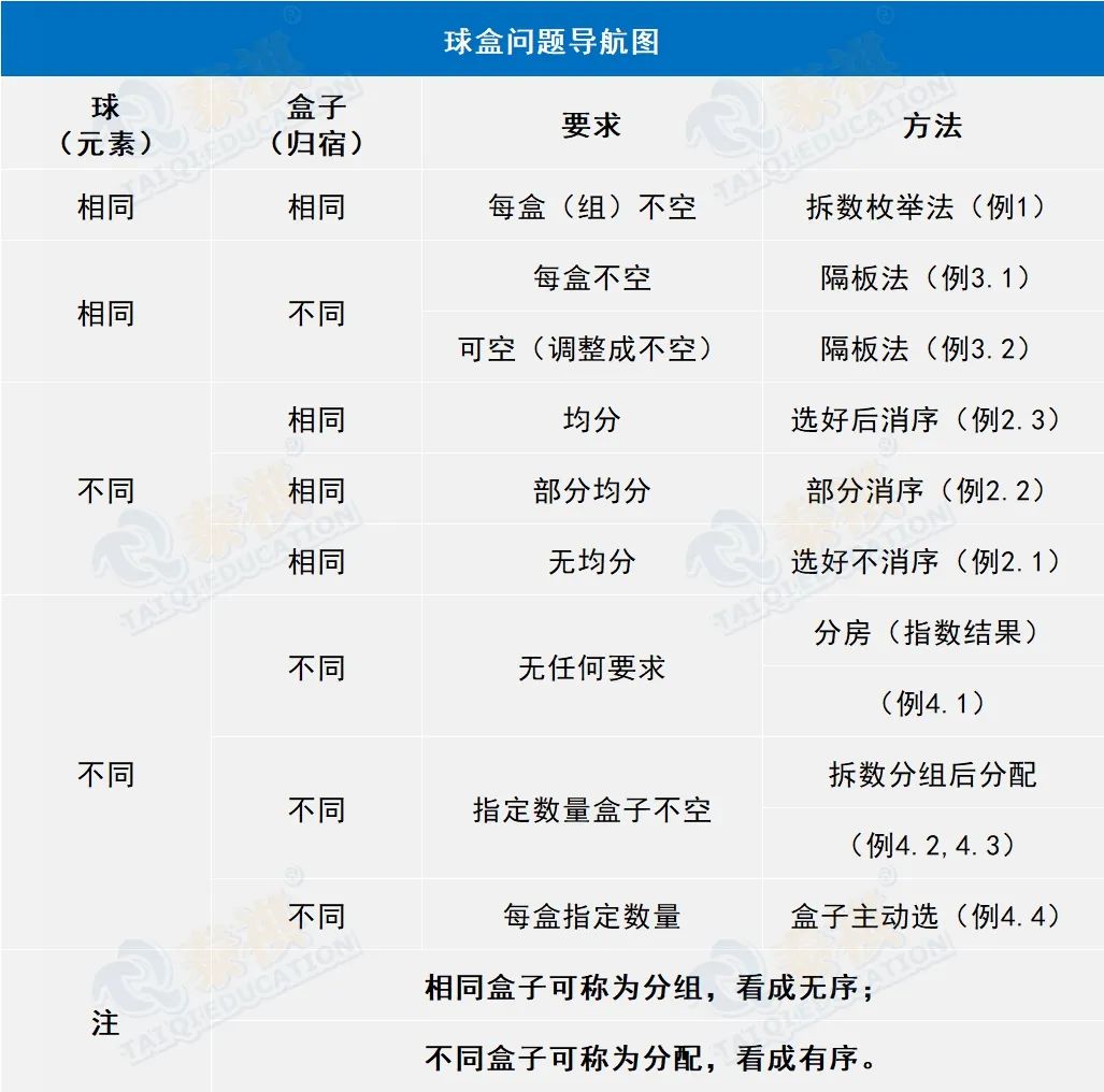 对于每一种情形,都有其各自不同的解题方法。为此,我们对“球盒问题”作了一个系统的归纳,在对比中加深理解。如能真正理解“球盒问题”,排列组合也就融会贯通了,俗称“打通任督二脉”,希望同学们能够抓紧考前最后的时候,好好理解,争取拿下这类题目。