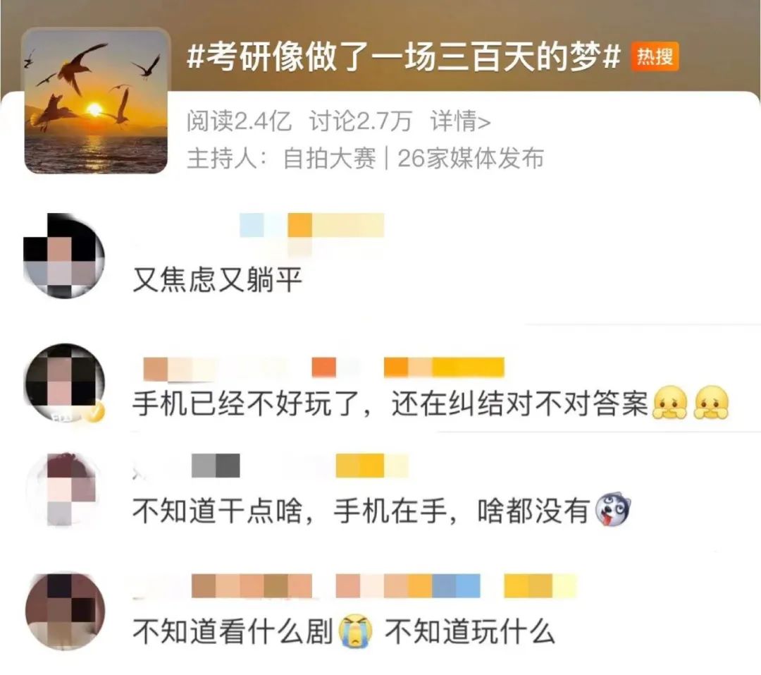 前几天,一个热门话题#考研像做了一场三百天的梦#在微博上引发了广泛讨论。评论纷纷表示对成绩感到担忧,不知能否过线;或者对未来感到迷茫,不知接下来该做些什么……