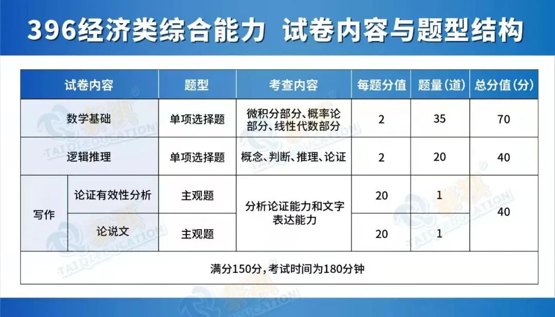 396经综的满分150分,数学35题,70分;逻辑推理20题,40分;写作2题,40分。