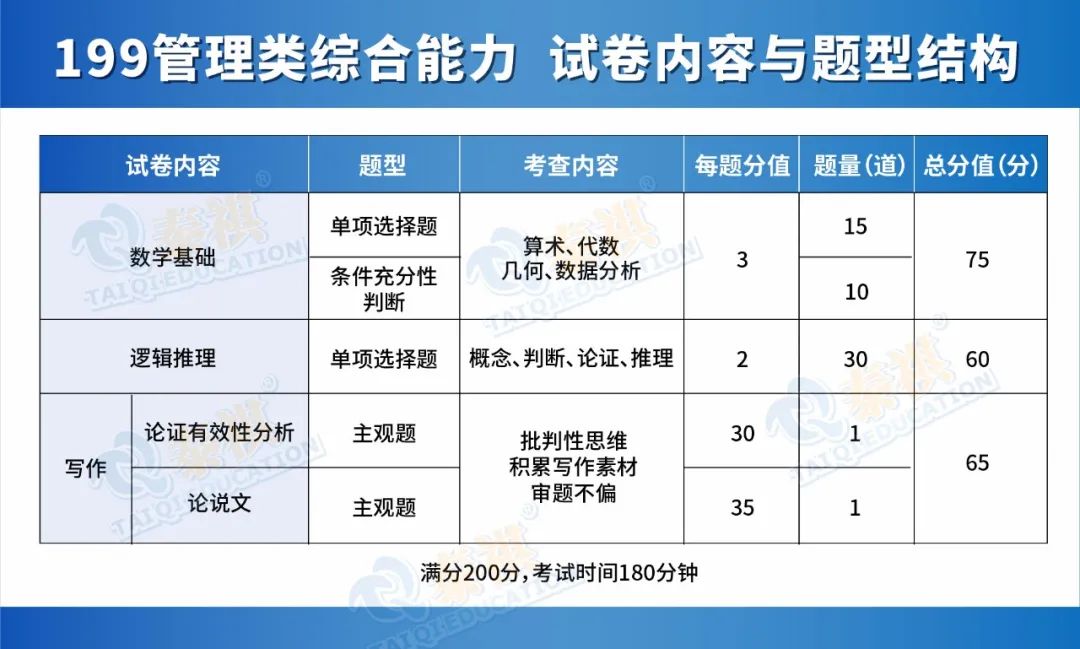 考试范围都是数学基础、逻辑推理以及写作三部分。而且逻辑和写作部分的考纲是基本相同的。