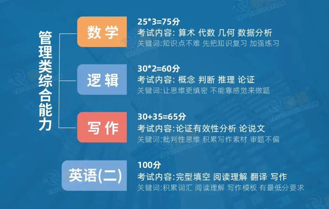 确定院校和专业后,就要开始初步备考了。在复习前要对考试科目、考试内容、报考流程做全面的了解,打牢基础,构建起知识框架。比如管理类联考一共考两门,管理类综合能力和英语(二)。
