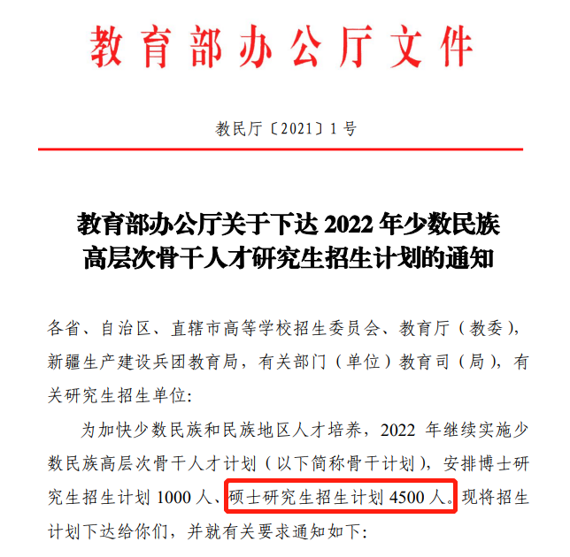 根据《教育部办公厅关于下达2022年少数民族高层次骨干人才研究生招生计划的通知》(教民厅〔2021〕1号)规定,2022年全国计划招收少干计划硕士研究生4500人,名额分配给全国155所院校,院校拿到名额后,再根据自身情况分配到适合的招生专业。
